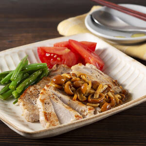 マッシュルームは1cm幅の薄切りにする。プチトマトは半分に切る。