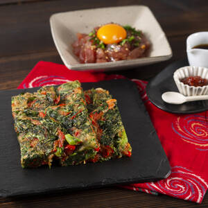 フライパンにごま油を入れて、温める。 〈2〉を全体に広げて、中火で3〜4分焼く。
