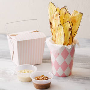 水を張ったボウルによく洗った金時芋を皮がついたまま2mmの厚さにスライサーでスライスして水気をよく拭く。
