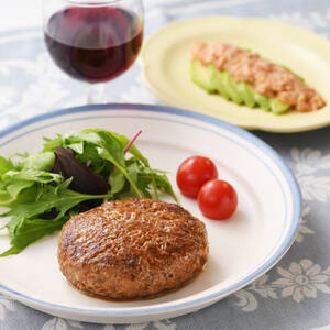 アボカドの縦2等分になるようにタネに沿って切り目を入れ、ひねって2等分にし、タネを取る。