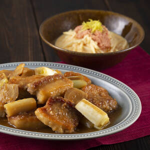 <2>を器に盛りつけ、上から<3>をかけ、レモンの皮を添える。