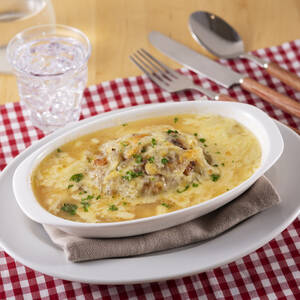 グラタン皿にハンバーグとスープを入れピザ用チーズをかけてトースターで焦げ目がつくまで焼く。