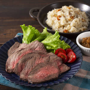 フリルレタスなどにローストビーフ、たれをのせ、ガーリックライスを巻いて召し上がる。