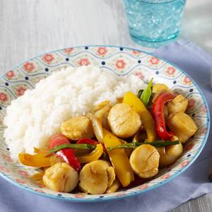 玉ねぎ、赤黄パプリカ、ベビーホタテを加える。