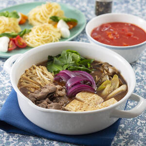 えのき、まいたけ、焼き豆腐を入れ、牛薄切り肉を加える。牛肉に火が入ったら、2のアーリーレッド、三つ葉を入れる。