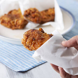肉をひっくり返したタイミングでバターを電子レンジ600Wで20秒加熱し、熱々のまま揚がった鶏肉の全体にかけたら完成。