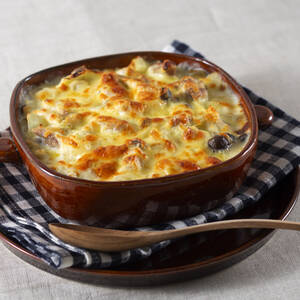 耐熱容器にバター(分量外)を塗り、<6>を入れて、チーズをちらして、トースターなどで焼き色がつくまで焼く。