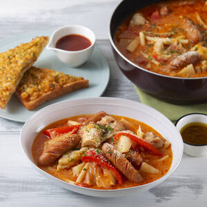 にんにくは薄切り、赤とうがらしはヘタと種を取り除く。鶏もも肉は一口大に切り、ウィンナーは切り込みを入れておく。