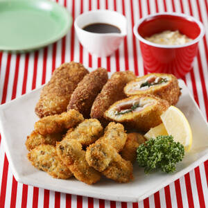 <4>の牡蠣に小麦粉、溶き卵、パン粉の順番で付け5分程置き、なじませる。 <3>のカニカマも同様に衣をつける。