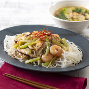 干し椎茸の戻し汁を入れ、ふつふつとしたら青梗菜の葉を入れ、醤油、塩を加え味を調える。