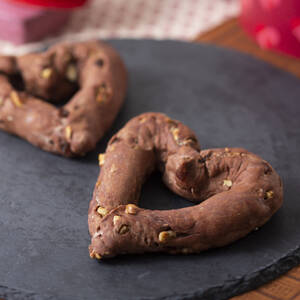 生地を手のひらでコロコロと伸ばす。伸ばした生地を天板の上でハート型になるように置く。