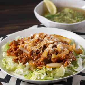 レタスは7〜8mm幅の細切りにして器にもる。玉ねぎは繊維と垂直向きに1cm幅に切る。