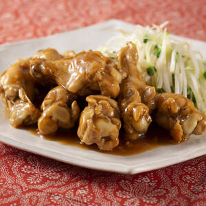 器に〈5〉の野菜を盛り、手羽元を盛り付ける。