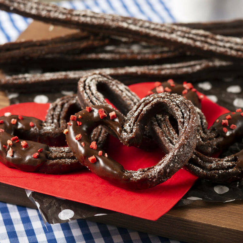 チュロスが冷めたら<15>のチョコレートをコーティングし、お好みでフリーズドライのいちごをトッピングして完成!