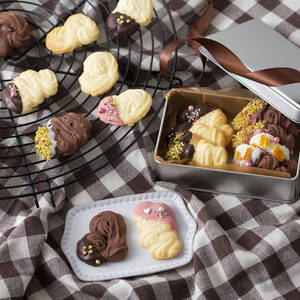 焼きあがったら粗熱を取り、溶かしたコーティングチョコを つけ、ナッツ、アラザンなどを散らす。