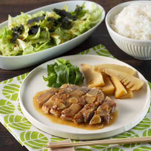 豚肉を取りだしてまな板にのせ、タケノコは器に盛りつけておく。
