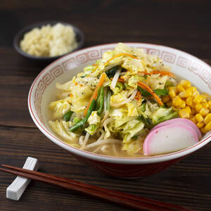 【盛り付け】器に麺を入れ、野菜を盛り、ダシを注ぐ。コーン、薄く切ったかまぼこを添える。