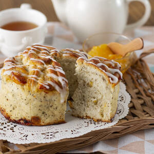 マーマレードジャムを塗って端からくるくるとロールケーキのように巻く。8等分する。