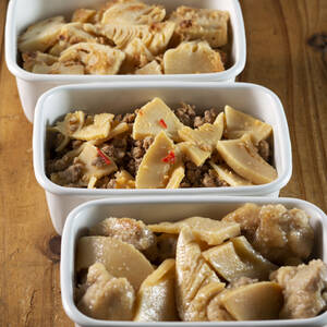 たけのこを炒める際、できるだけほったらかしておき、途中、1〜2回ざっとかき混ぜる程度にする。