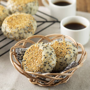 生地を8等分してあんを包み、表面に白ごまをまぶしてフライパンに置く。