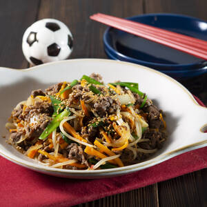 しんなりとしたら<1>の牛薄切り肉を加え、汁気が飛ぶまで強火で炒める。汁気が飛んだらニラを加え、さっと炒める。