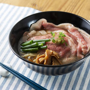 <5>を沸騰させ牛肉を軽く湯引きし、麺の上に乗せる。