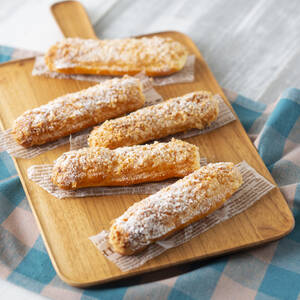 直径1cmの丸口金をつけた絞り袋に生地を入れ、オーブンペーパーの上に12cmの棒状に1本だけ絞る。