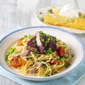 <8>にカツオのつけ汁(大さじ1)、<5>、パスタを加え、塩(少々)、こしょう(少々)で味を調える。
