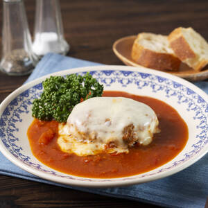 チーズを半分に折りたたみ、ハンバーグの上に載せてフタをして、チーズが溶けるたら器にもる。