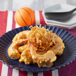鍋にサラダ油を少し入れ、<4>のソースとエビを入れてよく混ぜる。