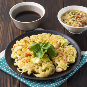 ボールに【A】の溶き卵、水を加え、全体を混ぜ合わせる。小麦粉(80g)を加え、粉が少し残る程度にさっくりと混ぜる。