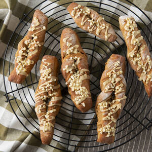 粗熱がとれたらアイシングをかける。大きめのアーモンドダイスを包丁で砕き、パンの上に散らして完成!