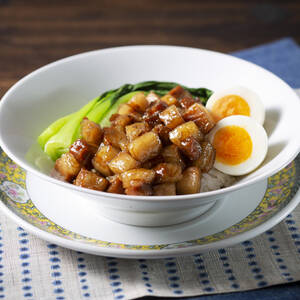 器にご飯、チンゲンサイ、半分に割った半熟卵、<10>を盛付けて完成。