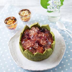 型から外したレアチーズの上に彩りよくゼリーをのせて飾る。