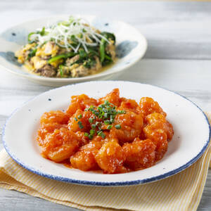 フライパンにサラダ油を引き、中火で加熱する。片栗粉をまぶした海老を両面焼き、一度取り出す。