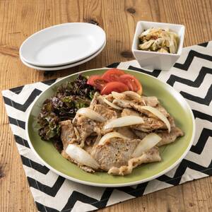 フライパンにごま油をひき、中火で加熱し、肉を片面焼いたら玉ねぎと袋に残った汁を加えて強火で加熱する。