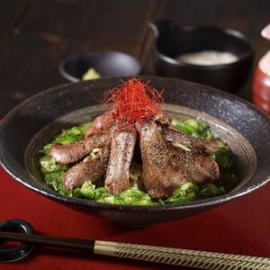 器に麺を山のようにこんもりと盛り、周りに<3>のきゅうりを盛る。焼いた牛タンを麺の上に放射状に並べ、タレをかける。