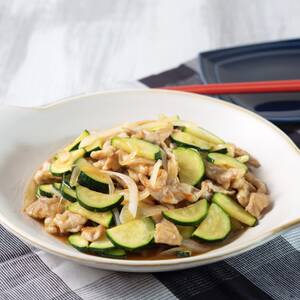空いたフライパンに玉ねぎとズッキーニをいれてサっと炒める。油が馴染んだら【B】を加え、豚肉を戻し入れて炒め合わせる。