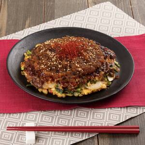 焼き上がったら食べやすい大きさに切って皿に盛り、ソースといり白ごま、糸とうがらしを飾って完成。