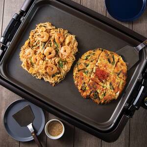 エビが両面焼けたら具を端に寄せ、温度を250℃に上げて溶いた卵を流し入れる。