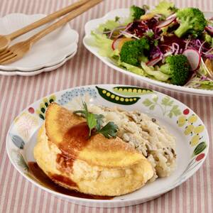 下が焼き固まったことを確認したら、バターライスがのった器にスライドさせてのせ、熱いうちに上部を少し折り曲げる。