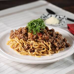 中火にし、牛ひき肉を入れて塩、こしょうをふり、更に炒める。牛ひき肉の色が変わったらトマトと梅干しを入れて軽く炒める。