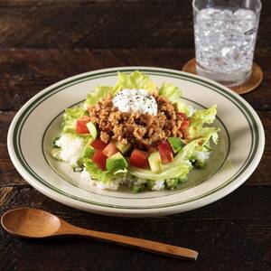器にオクラごはんを盛り、その上にレタスを広げる。まわりにトマトとアボカドを散らし、中央にタコスミートをのせる。