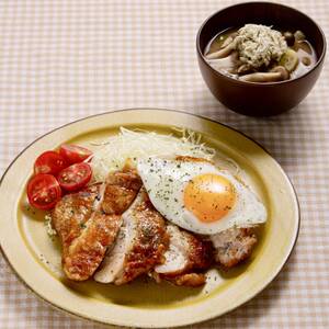 お皿に水気を切った千切りキャベツとミニトマト、鶏肉を盛り付ける。鶏肉の上に目玉焼きをのせる。