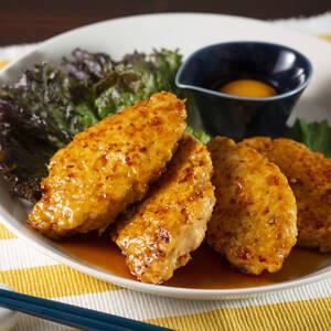 フライパンにサラダ油を入れ、中火で加熱する。温まったらつくねをスプーンで入れ、ラグビーボール型にスプーンで成形する。