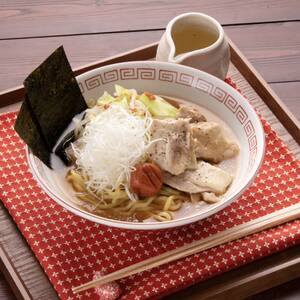 <9>で和えたキャベツともやし、<7>のチャーシュー、白髪ねぎ、トッピング用の梅干し、焼きのりをのせる。