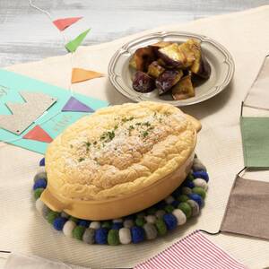 ご飯を盛り付けた耐熱容器に<8>をのせ、240℃のトースターで4分加熱したらアルミホイルを被せて220℃で3分加熱する。