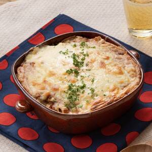 グラタン皿に茹で上がったペンネ、<7>、<12>の順に重ねていき、ピザ用チーズをかける。