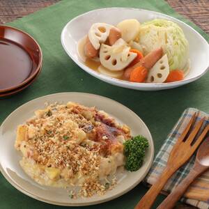 器に盛りつけ、お好みでオリーブオイル(少々・分量外)をふり、粒マスタード(少々・分量外)を添える。