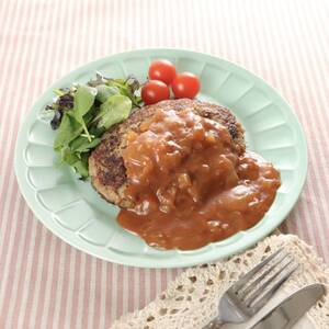 焼き上がったハンバーグと付け合せの野菜を皿に盛り、ソースをかけて完成。